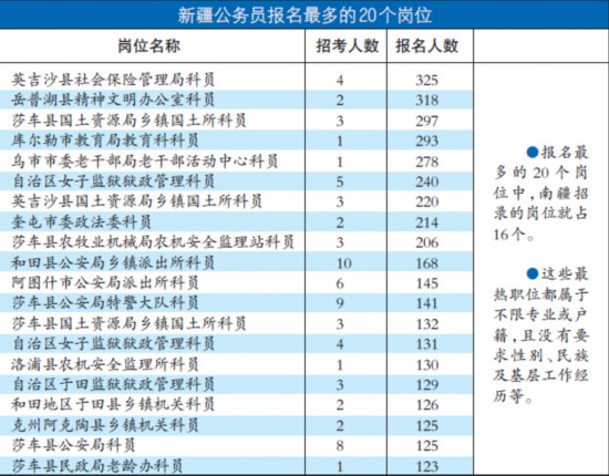 3月29日是新疆公務(wù)員考試報名的最后一天,當天公務(wù)員報名人數(shù)最多的前20個崗位公布,南疆招錄的崗位就占16個。競爭最激烈的崗位是庫爾勒市教育局科員一職,報名293人只招錄1人。目前還有512個繳費零空缺職位。