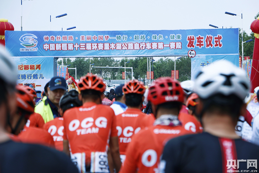 參加環(huán)賽里木湖公路自行車賽的車手等待比賽開始(央廣網(wǎng)見習記者 王天浩 攝)