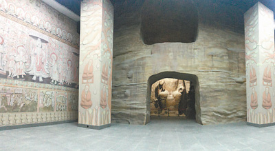 在青島城市傳媒廣場3D打印的云岡石窟第三窟外景和壁畫。 資料圖片