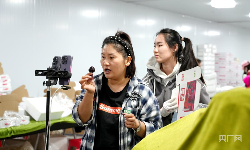 阿克蘇萬疆美果業(yè)有限公司工作人員在車間櫻桃包裝車間直播帶貨 (央廣網(wǎng)記者 丁安 攝)