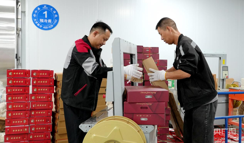 在櫻桃包裝車間,順豐快遞員李玉龍和同事協(xié)作,熟練地粘貼面單、規(guī)范打包,確保每一盒櫻桃都能完好無損。“每天12點左右我們就到基地,進(jìn)行櫻桃規(guī)格分選、面單粘貼和打包,最大限度提高物流時效,保障櫻桃安全高效出疆。”李玉龍說。