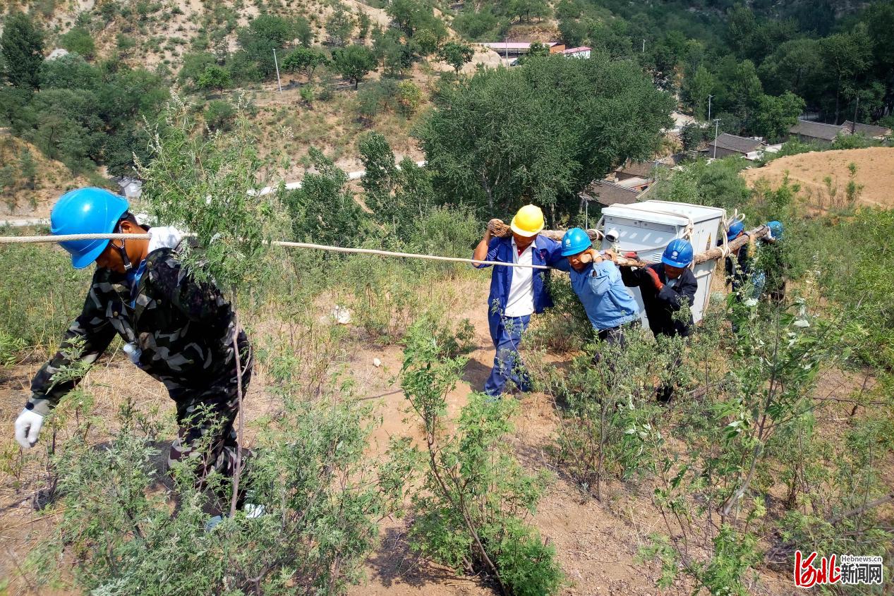 力量!2018年11月18日,國網(wǎng)阜平縣供電公司員工肩扛拉拽,為貧困村開展配變增容工程建設(shè)(陳平攝影)