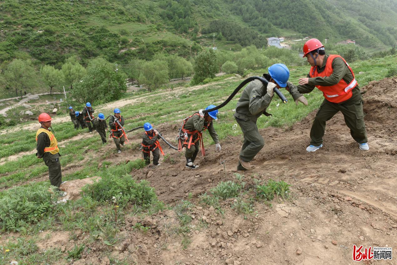 并肩!2018年5月26日,國網(wǎng)淶源縣供電公司員工為深度貧困村十八盤村架設(shè)供電線路(翟文濤攝影)