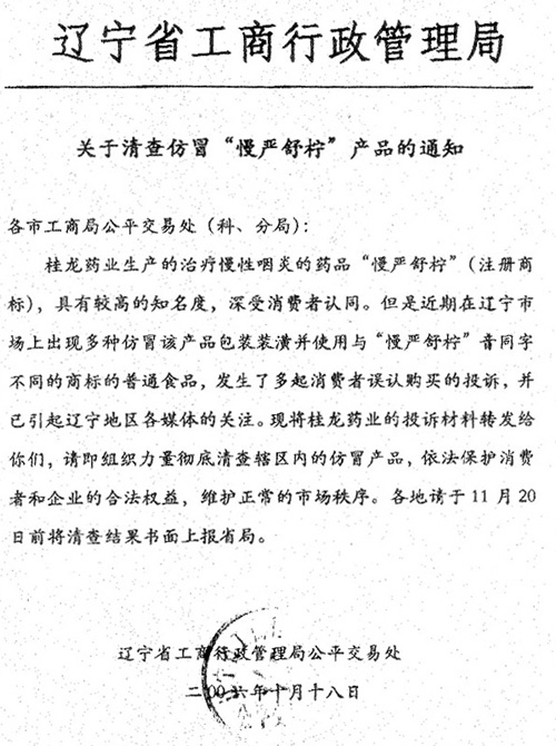 遼寧工商局清查仿冒"慢嚴舒檸"的通知
