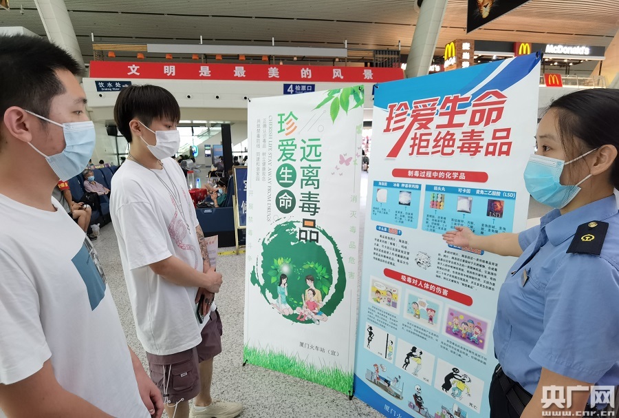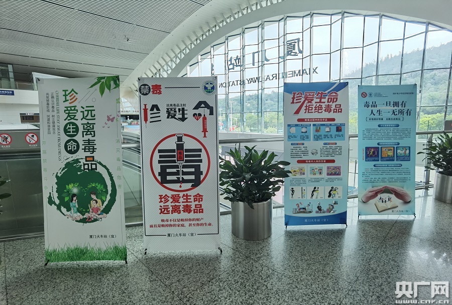 在宣傳活動中,廈門火車站以擺放宣傳展板、發放毒品警示資料、播放禁毒警示標語等形式進行禁毒宣傳,吸引不少旅客駐足觀看。