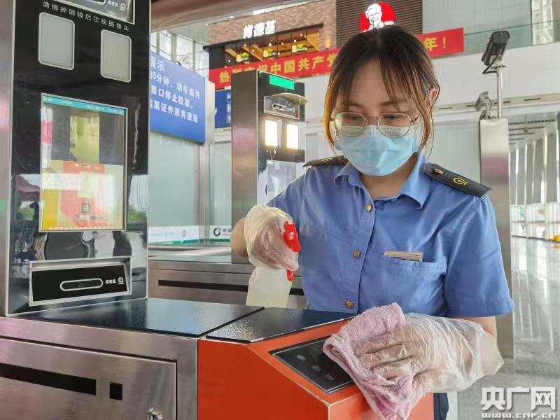 車站工作人員在對進站閘機消毒(央廣網發 通訊員供圖)