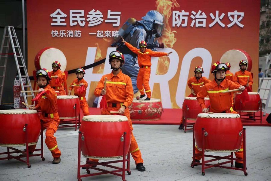 消防員在表演《消防鼓韻》(央廣網發 曾德猛 攝)