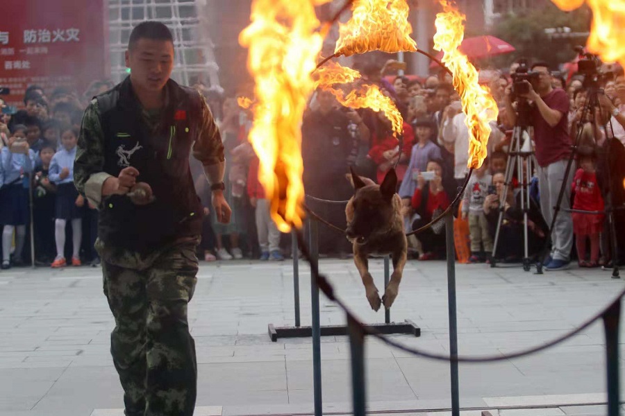 消防戰士在指揮搜救犬跳火圈(央廣網發 曾德猛 攝)