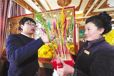春節、藏歷新年期間,我區旅游市場持續升溫,大批游客進藏過年,游客們在領略西藏獨特自然風光的同時,還感受了藏歷新年的節日氛圍。圖為來自河南的游客(左)在拉薩感受藏族傳統儀式吃“切瑪”。本報記者 旦增西旦 攝