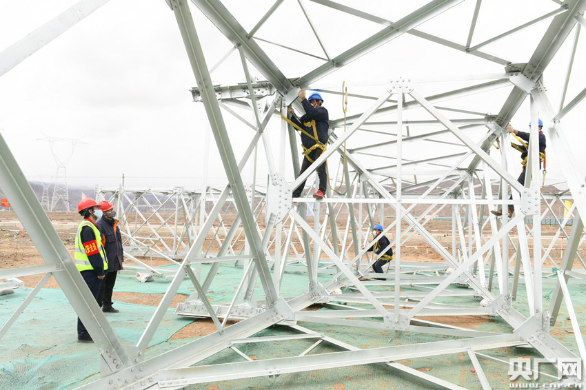 阿里與藏中電網聯網工程查務500千伏變電站新建工程——鐵塔螺栓緊固(央廣網發 閆昱翰 攝)