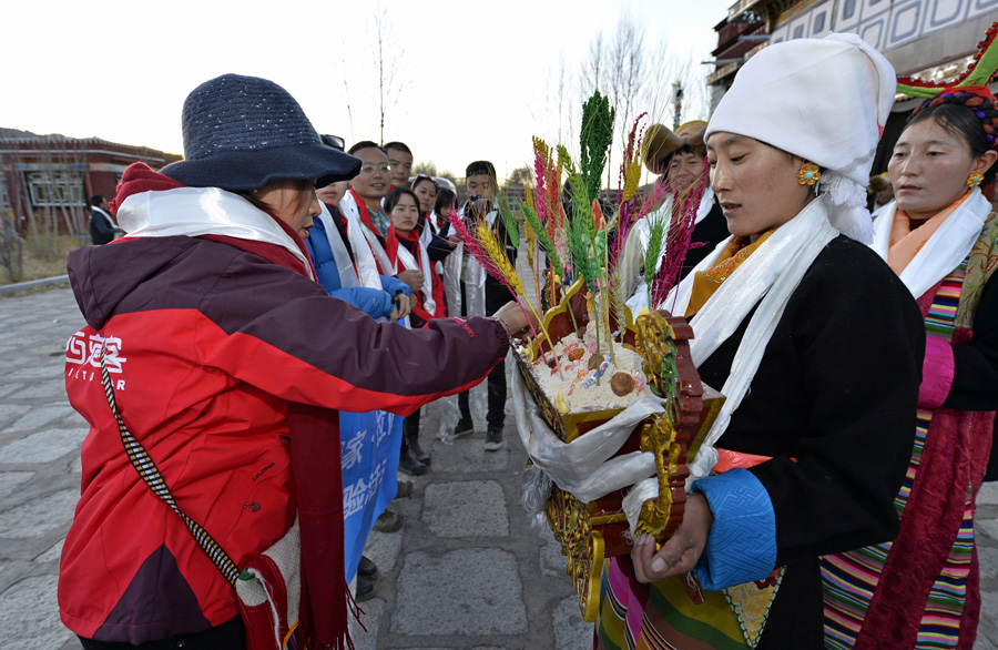 11月12日,在位于拉薩市林周縣的一個(gè)家庭旅館外,藏族群眾端著切瑪盒(五谷豐收斗),迎接前來(lái)體驗(yàn)藏家風(fēng)情的游客。 近日,由拉薩市旅游局等主辦的“冬游藏家·拉薩人家體驗(yàn)游”活動(dòng)在拉薩老城區(qū)及周邊縣鄉(xiāng)開(kāi)展,為游客提供了一次體驗(yàn)雪域高原冬季獨(dú)特魅力的機(jī)會(huì)。 新華社記者 劉東君 攝