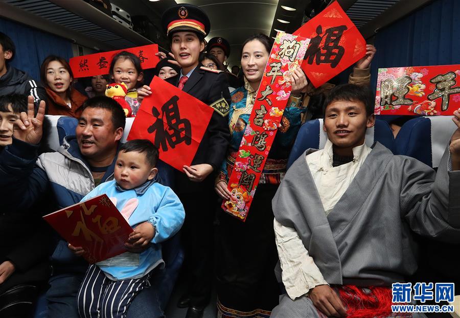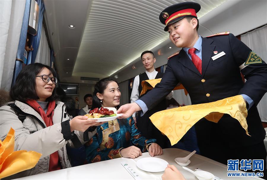 •      2月7日,乘務員在列車上為返鄉的同濟大學學生送上餐食。新華社記者 陳飛 攝   近日,在上海至拉薩Z164次列車上,乘務員與旅客開展了“迎新春、送福字、把吉祥美好帶回家”活動,營造暖心的旅程。