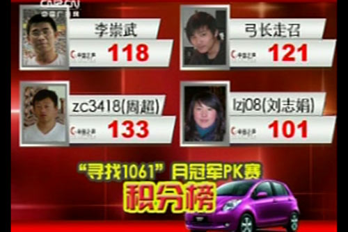 “尋找1061”第三個月冠軍在6月25日22:00的《1061第三個月冠軍PK賽》中誕生。四位周冠軍李崇武、張超、周超、劉志娟激戰兩小時,最后,周超勝出。中國之聲、中國廣播網進行了全程音視頻直播。讓我們一睹四位周冠軍的個精彩表現吧。
