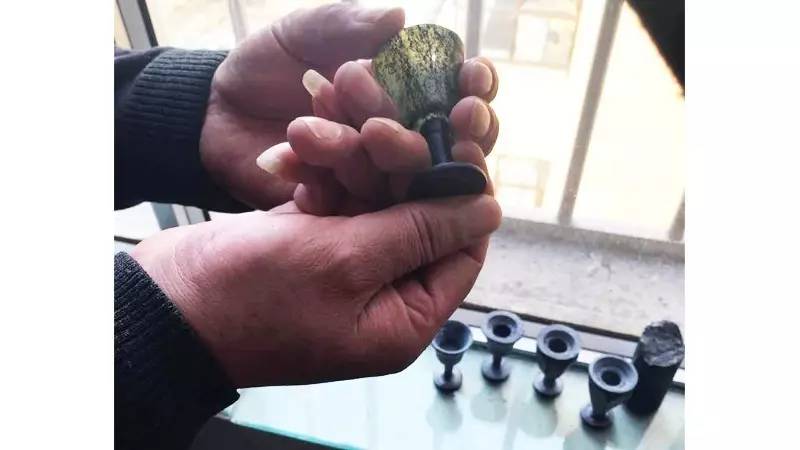 權玉廷展示不同階段夜光杯半成品