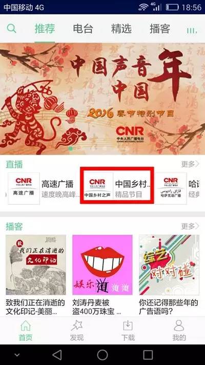 3、可到各大應(yīng)用市場下載“中國廣播”客戶端,在推薦頁可以找到“中國鄉(xiāng)村之聲”,點一下就能聽啦!