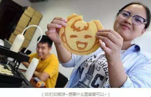 就在上個星期,青島的一家咖啡酒館還舉辦了一場3D打印體驗活動,活動的一個環(huán)節(jié)就是顧客自己設(shè)計、打印3D卡通煎餅。我看了一下,這款煎餅打印機工作原理和普通打印機差不多,只不過是將墨水換成雞蛋面粉,將紙張換成一個烤爐。按下開關(guān),機器料瓶就像畫筆一樣,在烤盤上面畫煎餅了。