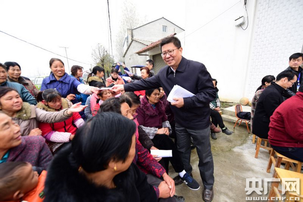 中央人民廣播電臺副總編史敏正在給村民們發宣講小冊子