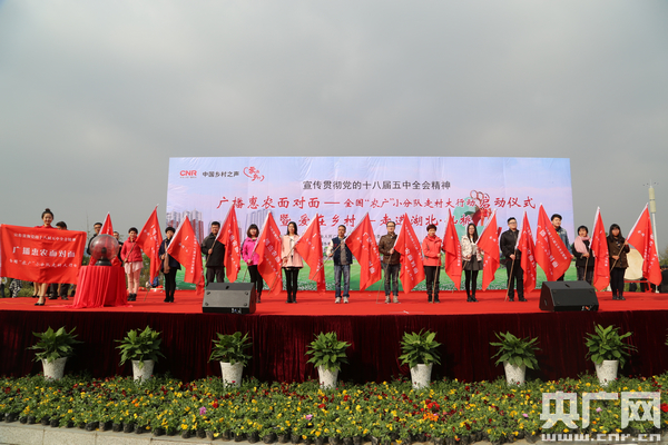 中央人民廣播電臺副總編輯史敏為參加此次活動的全國14個地方電臺代表授旗,這標志著“走村大行動”正式啟動。