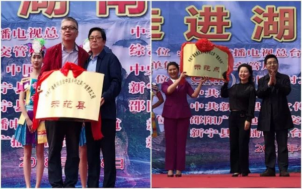 演出開始前,中央廣播電視總臺與新寧縣舉行簽約儀式,授予新寧縣“中央廣播電視總臺中國鄉(xiāng)村之聲廣播惠農(nóng)工程示范縣”和“中央廣播電視總臺中國鄉(xiāng)村之聲‘愛在鄉(xiāng)村’示范點(diǎn)”稱號。