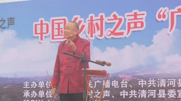 中國鄉村之聲首屆“尋找鄉村名嘴”冠軍宋云生為大家帶來自學的京東大鼓表演《愿大家天天都有好心情》。他韻味悠長的唱腔中飽含著對現場觀眾的美好祝愿。
