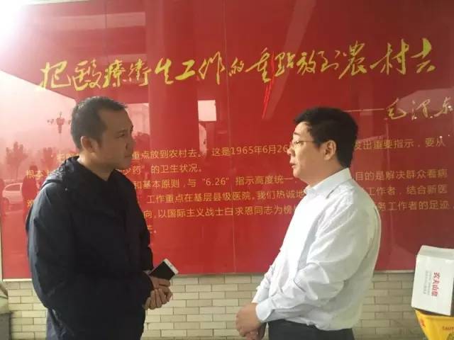 中國鄉村之聲記者田龍采訪臨潁縣人民醫院副院長呂永軍。就像背后的標語一樣,“愛在鄉村”公益活動就是要“把醫療衛生的重點放到農村去”。