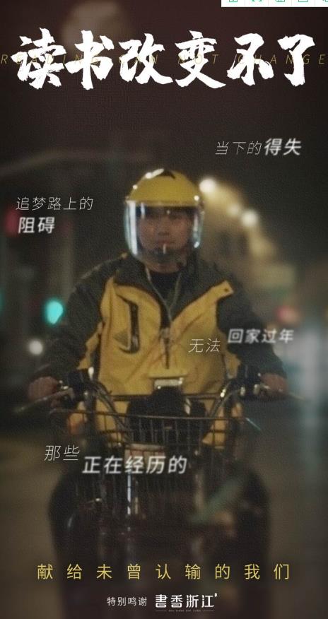 《讀書改變不了》圍繞“閱讀改變不了正在經歷的,但能讓你看見更好的未來”為主旨,以小故事的形式穿插敘事,生動呈現了三位處于人生低谷的年輕人通過閱讀調節心態、渡過難關、成就自我的勵志故事。短片展現了當下許多人真實的生活狀態,或許每個人都能從這三位主角身上看到自己的影子:職場白領因為工作失誤導致客戶不滿,面臨著失去合作機會的巨大損失,但他通過閱讀《深度工作》重拾信心,用積極的工作態度找到解決問題的辦法,贏得客戶的信任;女大提琴演奏家因為疫情加重無法遠赴法國參加世界級比賽,失去了在國際舞臺上嶄露頭角的寶貴機會,但她在《主角》這本書中看到了同為藝術家的主角一生的興衰際遇、起廢沉浮,于是她決定不再消沉下去,只要心中有舞臺,走到哪里都是主角;外賣配送小哥因為大雨耽誤了給客戶送餐,被客戶訓斥并退餐后留下了委屈的淚水,當他坐在臺階上收聽著德云社相聲,重燃起對生活的熱情,并以樂觀的態度繼續奔波在送餐的平凡之路上。
