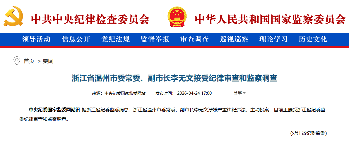 央廣網(wǎng)溫州4月24日消息(記者 項(xiàng)楠)4月24日,記者從中央紀(jì)委國家監(jiān)委網(wǎng)站獲悉,浙江省溫州市委常委、副市長李無文涉嫌嚴(yán)重違紀(jì)違法,主動(dòng)投案,目前正接受浙江省紀(jì)委監(jiān)委紀(jì)律審查和監(jiān)察調(diào)查。